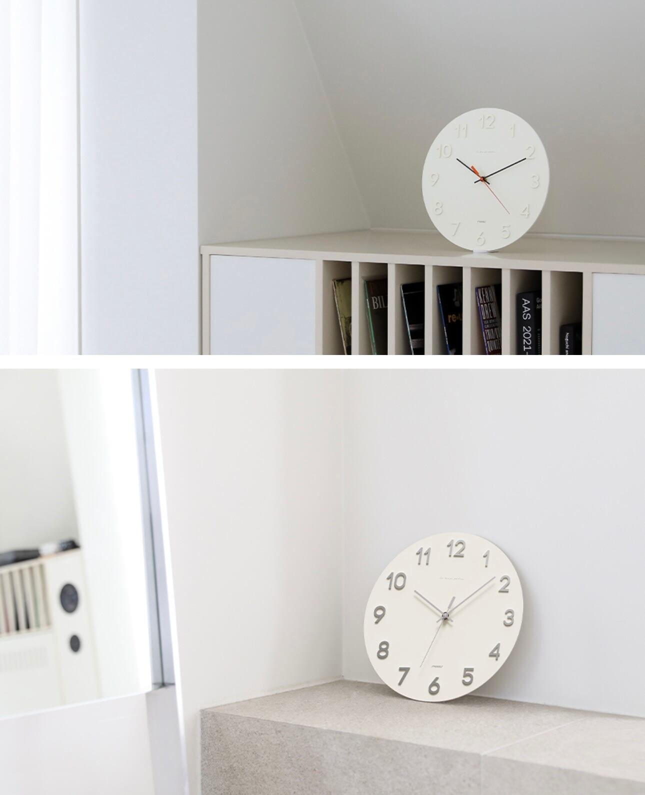 ウォールクロック/ スタンドクロックの2way仕様 ナチュラルでスタイリッシュな時計です。 カラー:シルバー(option1)、クリーム(option2) サイズ:D300*35mm 重量:約330g 電源:乾電池 素材:MDF、aluminum 無音ムーヴメント