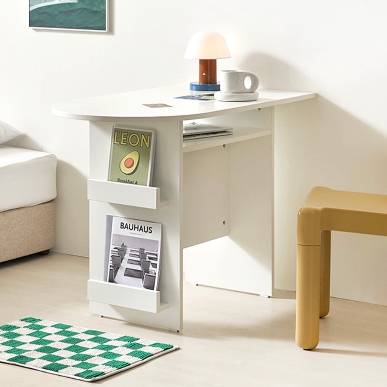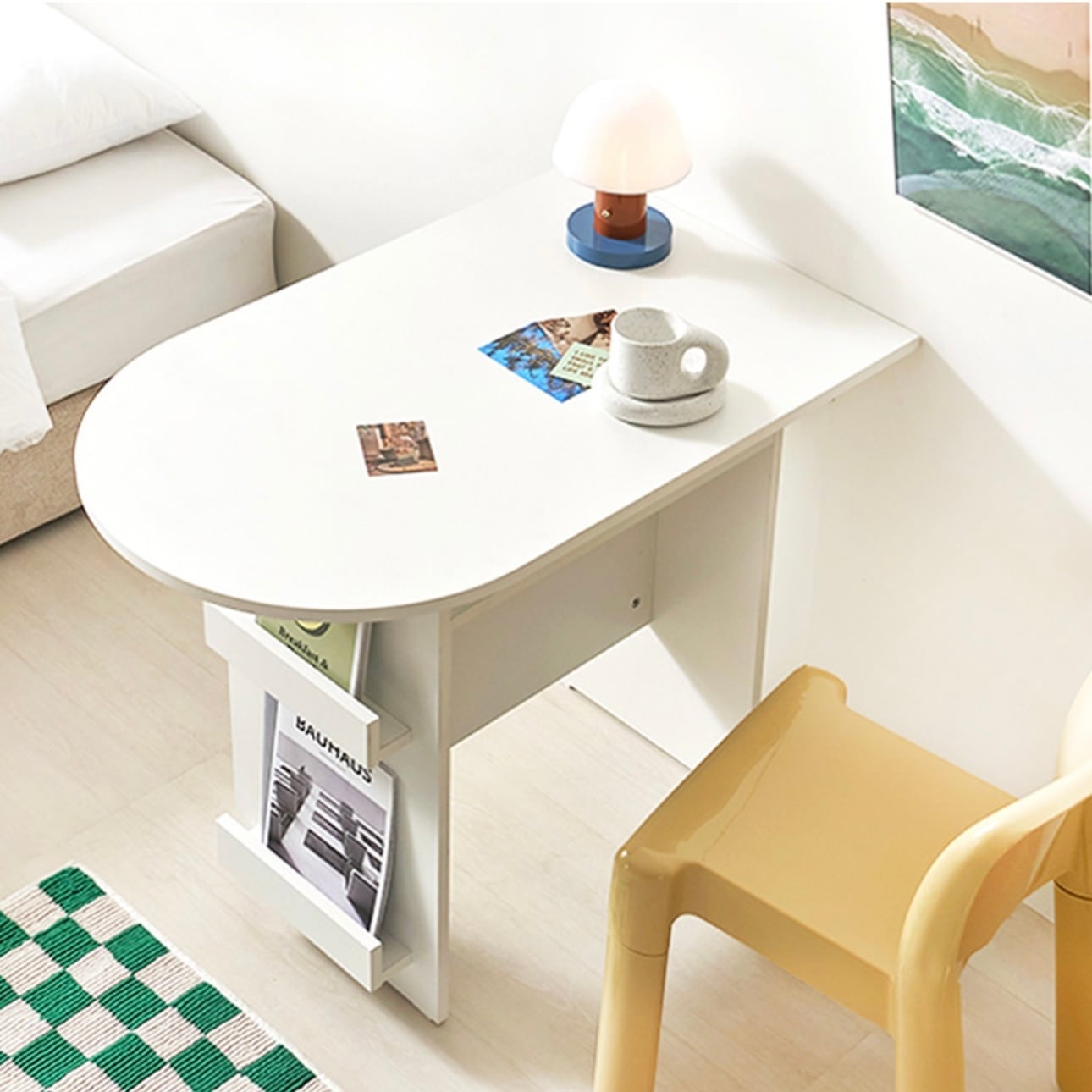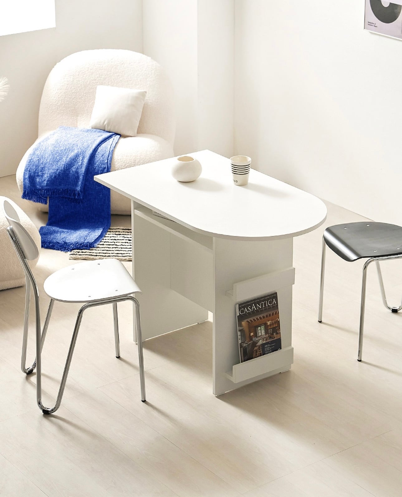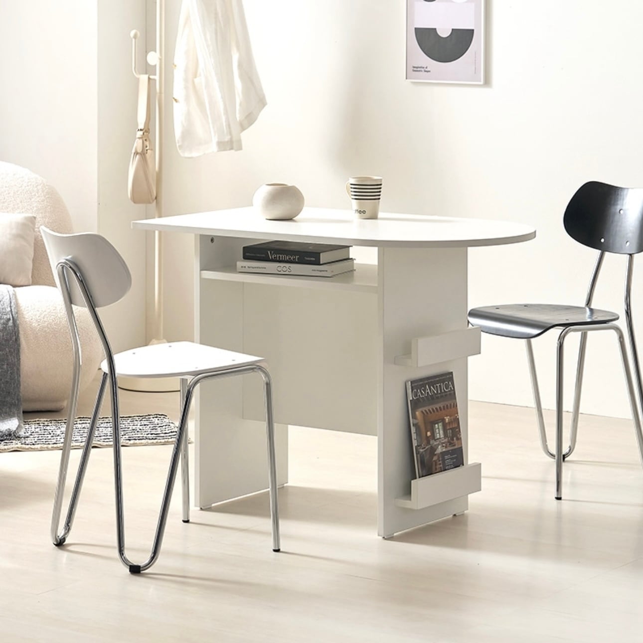 環境と人体に優しいE0素材 汚れやスクラッチに強い プレミアムLPMコーティング板使用 マガジンラックと収納スペースが付いたおしゃれなハーフラウンドテーブル カラー:ホワイト、オーク サイズ:詳細は写真をご参照ください。 素材:PB LPM
