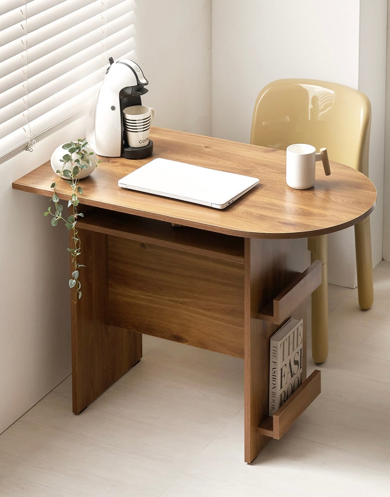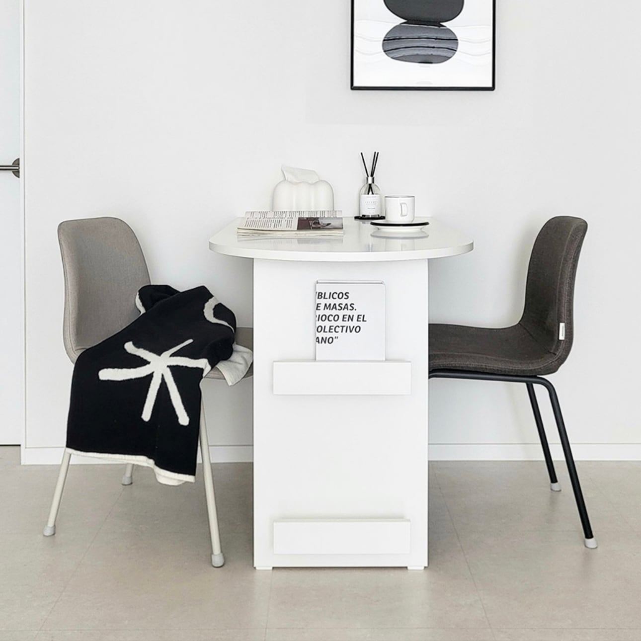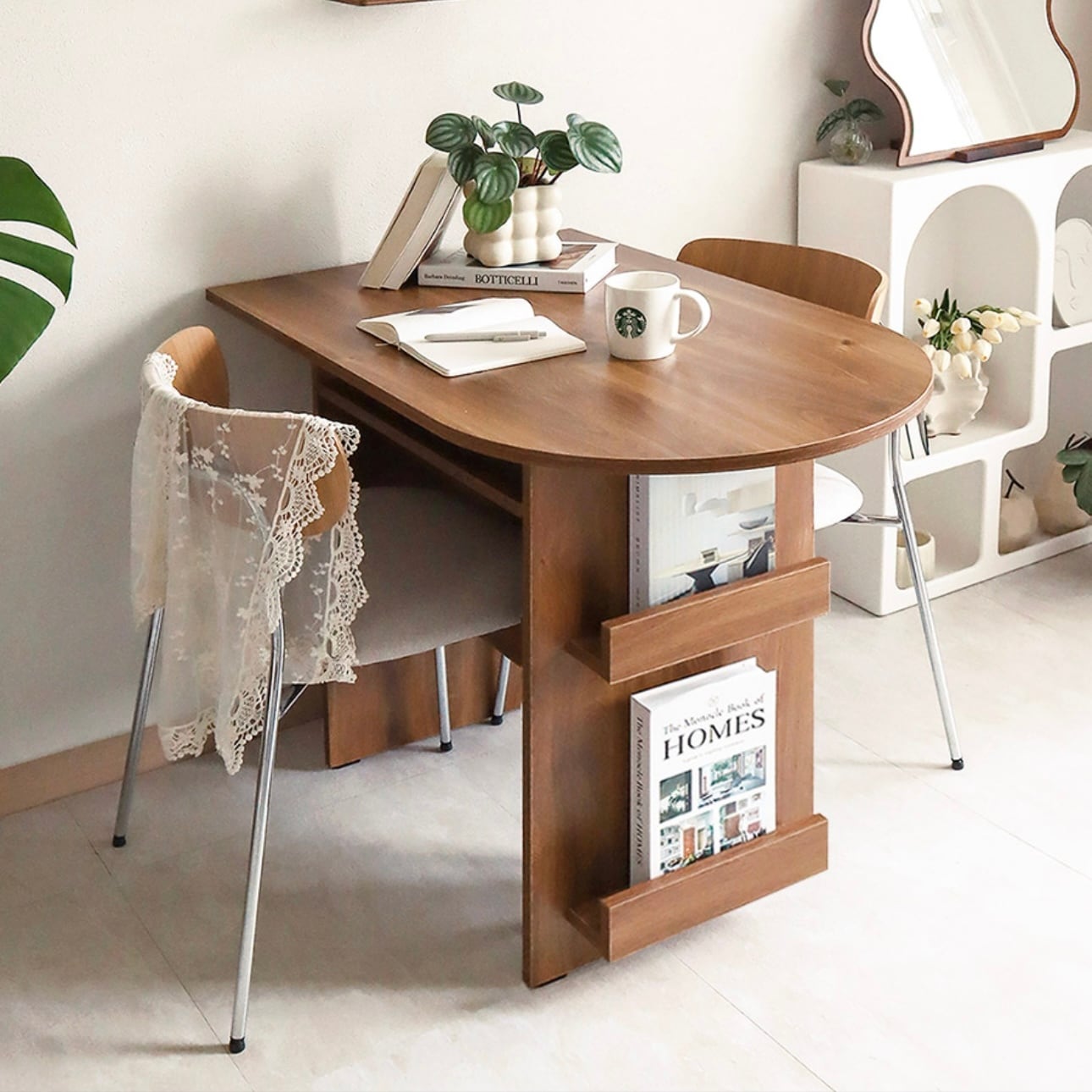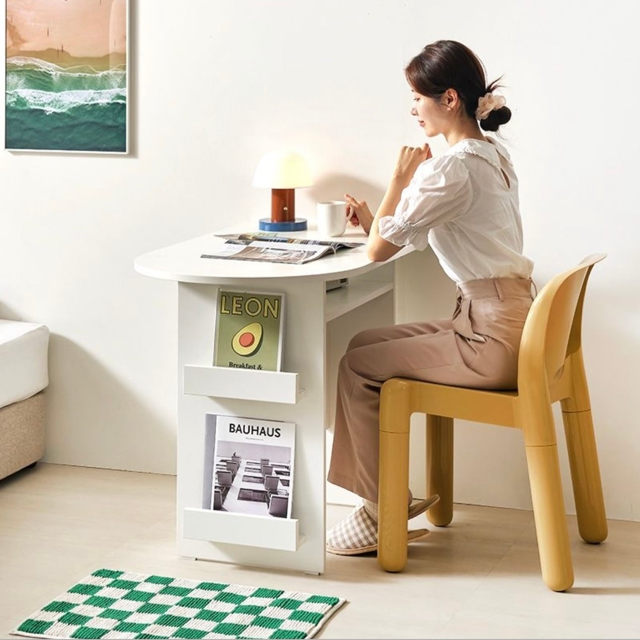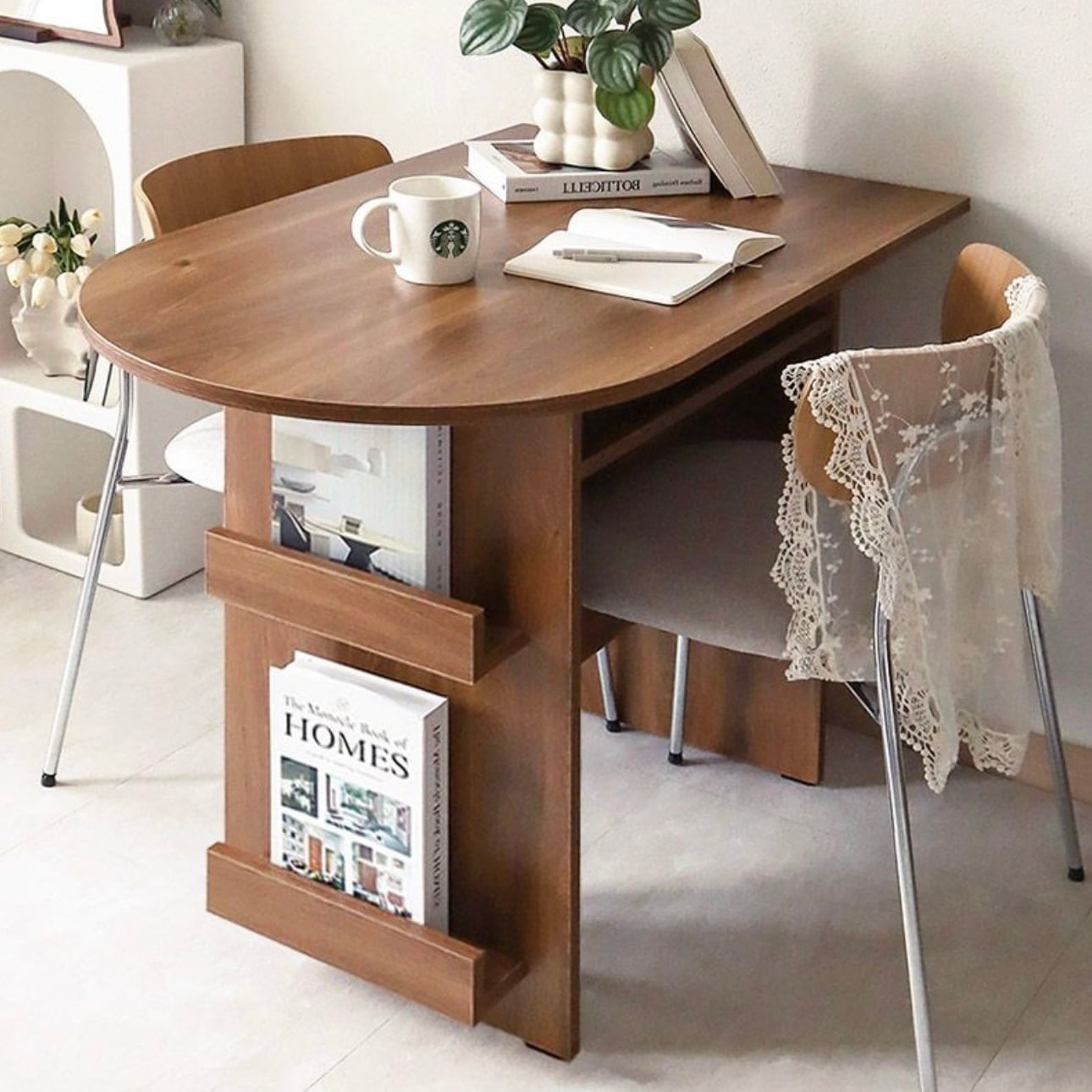環境と人体に優しいE0素材 汚れやスクラッチに強い プレミアムLPMコーティング板使用 マガジンラックと収納スペースが付いたおしゃれなハーフラウンドテーブル カラー:ホワイト、オーク サイズ:詳細は写真をご参照ください。 素材:PB LPM