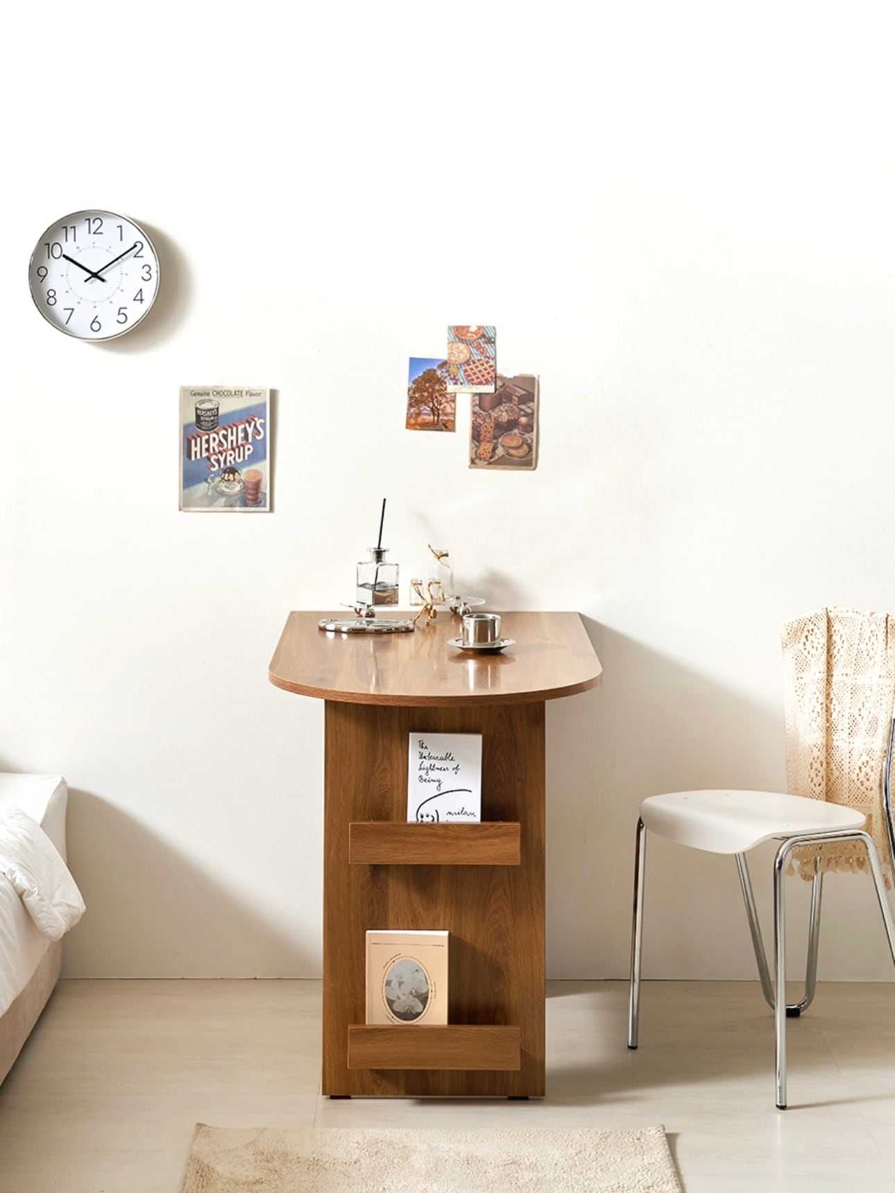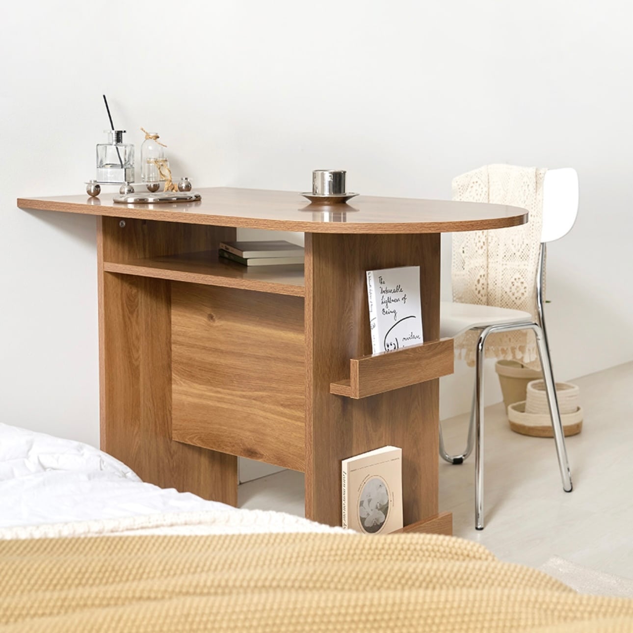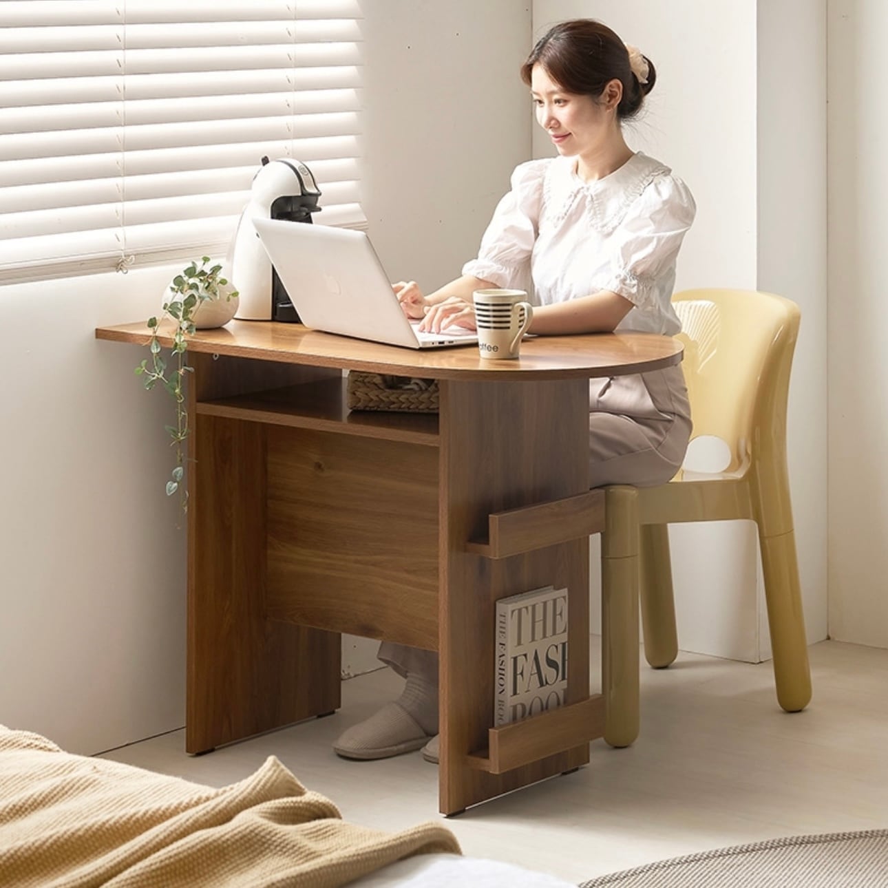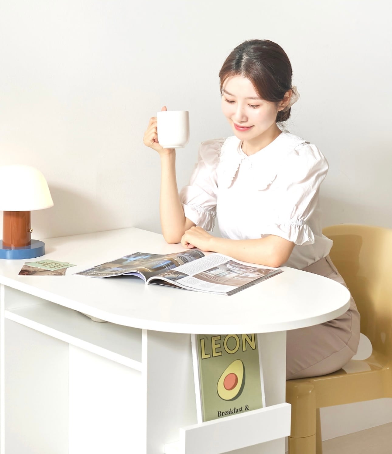 環境と人体に優しいE0素材 汚れやスクラッチに強い プレミアムLPMコーティング板使用 マガジンラックと収納スペースが付いたおしゃれなハーフラウンドテーブル カラー:ホワイト、オーク サイズ:詳細は写真をご参照ください。 素材:PB LPM