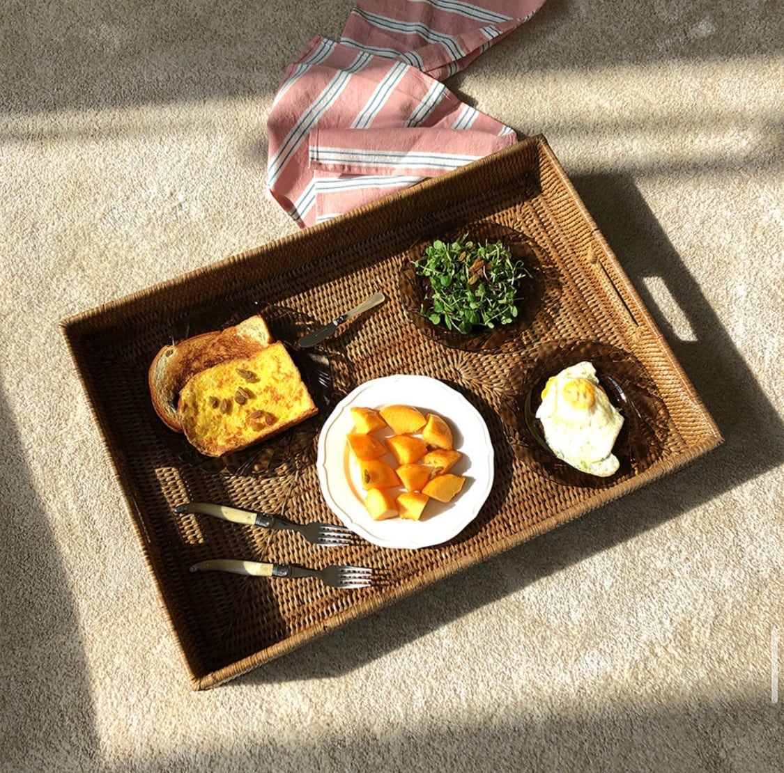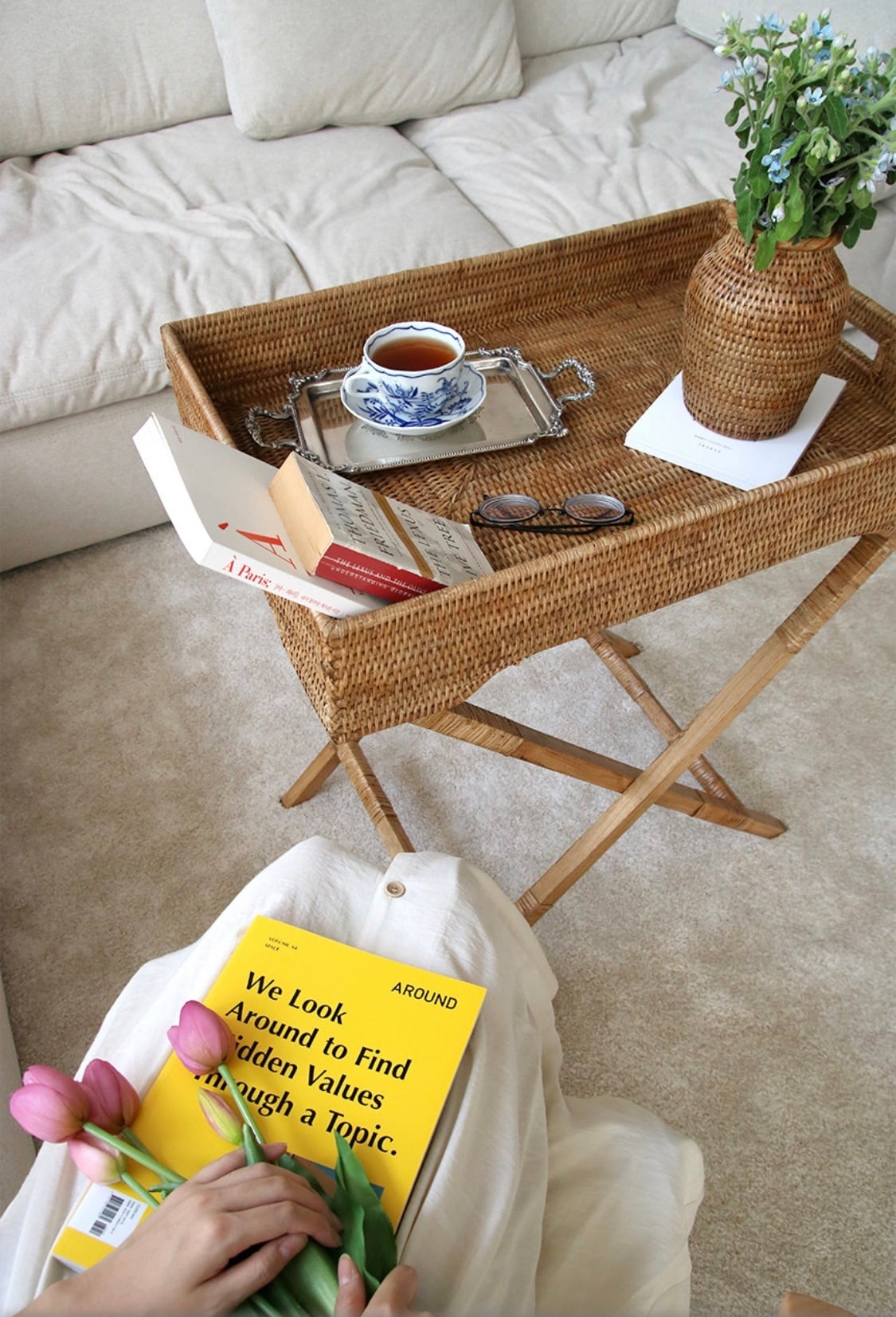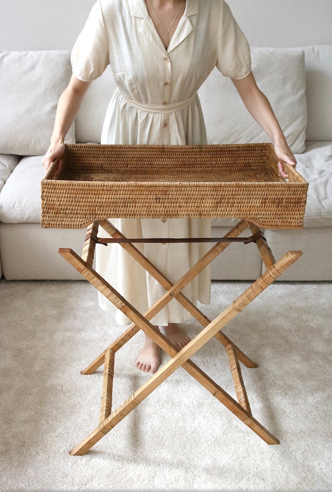 プレミアムラタン トレーテーブル トレー部分は取り外し可能 折りたたんで保管、持ち運び可能なのでピクニックやキャンプにもおすすめです◎ 写真のラタン チェアはこちらから♪ https://www.tokkimaeul.com/items/32420010 サイズ:65*45*75cm 素材:天然ラタン、原木