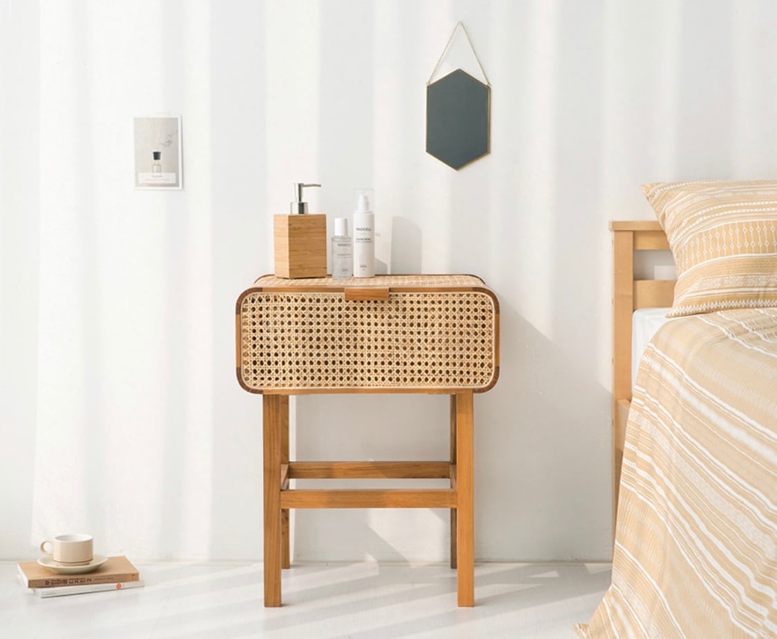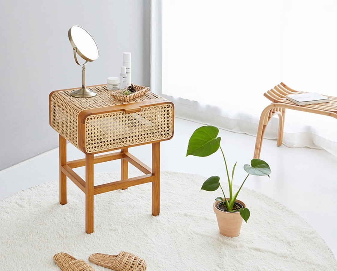 ナチュラルなインテリアのポイントに 収納スペース付きで実用性の高いハンドメイドラタンサイドテーブルです◎ サイズ:詳細は写真をご参照ください 素材:rattan、teak wood 重量:7.5kg