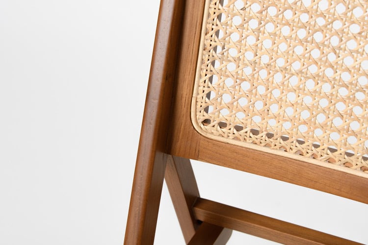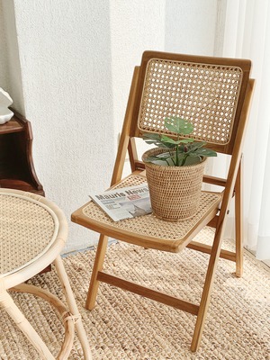 折りたたみ式なので使わないときは畳んで収納可能 背もたれ部分もラタン製のプレミアムチェア カラー:ナチュラル、ウォールナット サイズ:42*50*H80cm 素材:チークウッド、ラタン