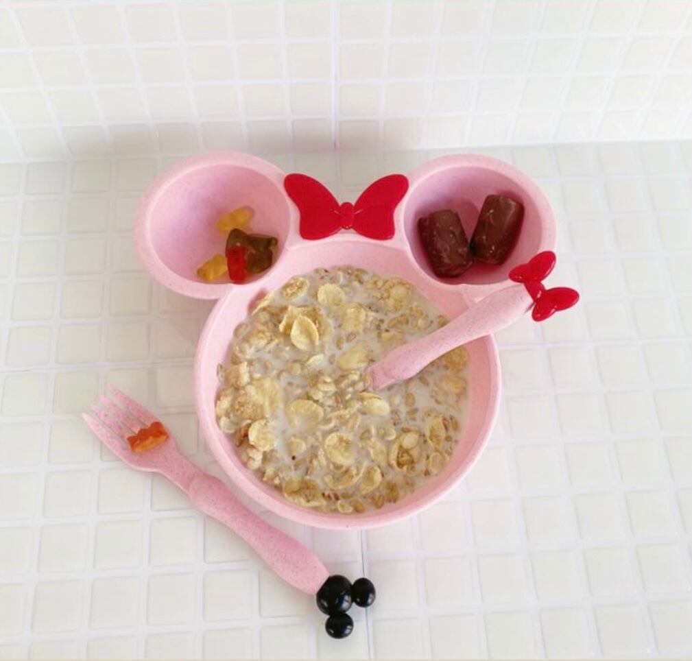 可愛いミッキーミニー型♡ シリアルボウル+フォーク+スプーン 3点セット カラー:ブルー、グリーン、ベージュ、ピンク サイズ:約21*21*3.5cm 素材:環境に優しいstraw+PP