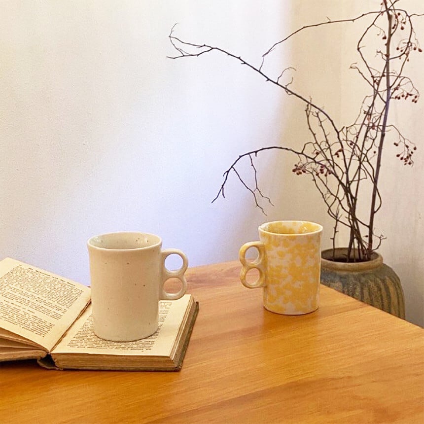ユニークな持ち手とデザインがポイント おうちカフェにぴったりなマグカップ♡ カラー:イエローマーブル、ブルーマーブル、ピンク、アイボリー サイズ:D8*H10 容量:310ml 素材:セラミック hand made